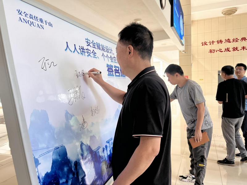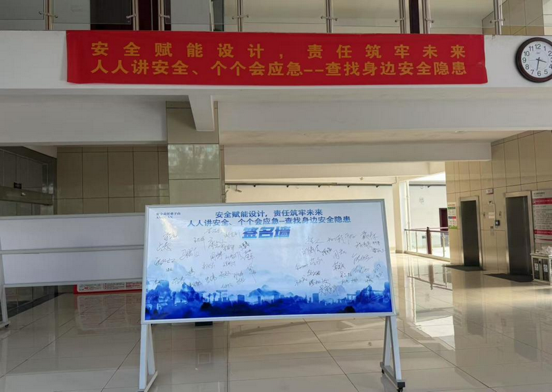 视觉冲击强:在院公司显著地点悬挂“安全赋能设计,责任筑牢未来——人人讲安全、个个会应急查找身边安全隐患”的安全月宣传条幅,烘托宣传氛围。