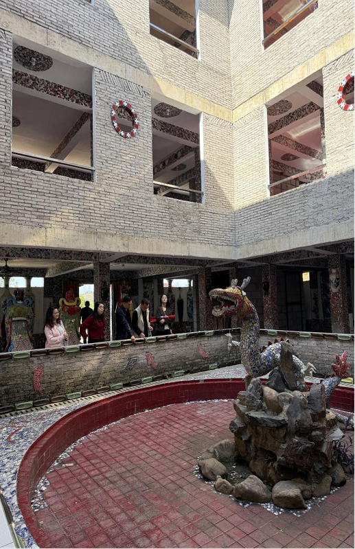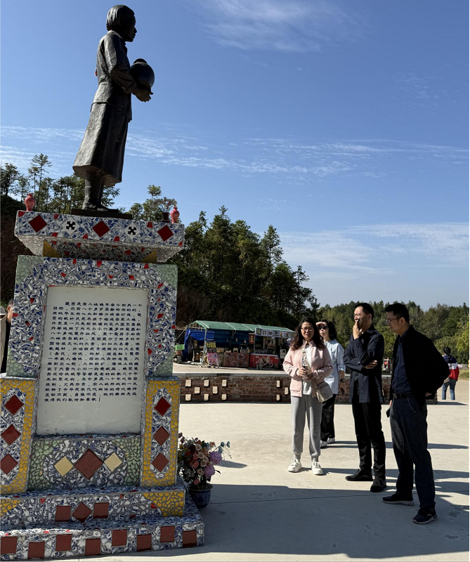 抵达瓷宫文化基地,入口处“千年瓷宫万年藏”的醒目题字彰显了陶瓷文化的深厚底蕴,全体成员在此合影留念。随后,成员们来到瓷宫创始人余二妹女士的纪念墓前,彩色瓷片镶嵌而成的墓碑详细记载了这位九旬“瓷宫奶奶” 倾尽毕生积蓄、耗时五年匠心打造瓷宫的感人事迹。大家静立碑前,仔细阅读碑文,深入了解老一辈工艺家对陶瓷文化的执着坚守与无私传承,内心深受触动,更对“敬老”的内涵有了更为深刻的理解。